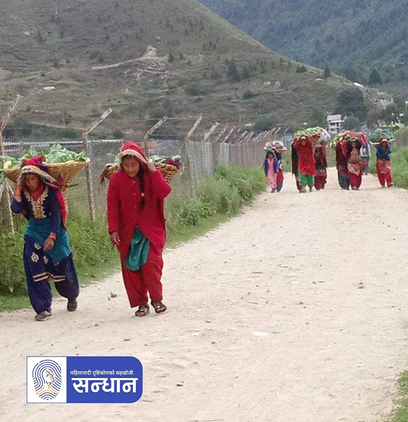 जुम्ला सदरमुकामदेखि गाउँहरूसम्म अहिले कच्ची बाटो त पुगेको छ तर सार्वजनिक सवारी साधन चल्दैनन् । यसैले व्यावसायिक तरकारी खेती गरेका महिलाहरू बजार खोज्दै आफैँ भारी बोकेर पैदलै सदरमुकाम धाउन बाध्य छन् । “च्याउ बेच्न बजारमै आउनुपर्छ,” भर्ना भन्छिन् । भारी बोकेर बजार धाउनु दुरदराजका किसान महिलाको सामूहिक बाध्यता हो ।