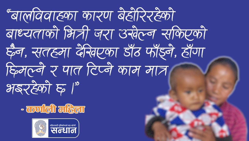 बालविवाहकै कारण कुनै पनि कोणबाट परिपक्व नहुँदै गर्भधारण गरी बच्चा जन्माउने, आमा बनी स्तनपान गराउने, शिक्षालाई निरन्तरता दिन नपाउने, छोराको आशामा छोटो अवधिमै धेरै सन्तान जन्माउनुपर्ने, घरपरिवारको चौतर्फी बोझ थाम्नुपर्ने, आधारभूत स्वास्थ्य सुविधामा पहुँच नहुने, आकर्षक रोजगारीका अवसरबाट वञ्चित हुने जस्ता बाध्यता कर्णालीका महिलाहरूले बेहोरिरहेका छन् ।