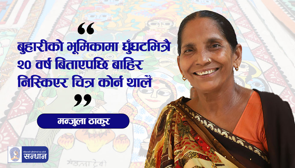 केही दिनअघि मात्रै जनकपुर उपमहानगरपालिका वडा नम्बर १२ स्थित नारी विकास केन्द्र पुगेर ‘सन्धान’ टोलीले उहाँसँग भेट्यो । उहाँको जीवन भोगाइ र चित्रकलाको बारेमा नजिकबाट बुझ्न खोज्यो । प्रस्तुत छ, मिथिला कलाका सर्जक मन्जुला ठाकुरसँग लक्ष्मी बस्नेत र गार्डिका बज्राचार्यले गरेको कुराकानी :
