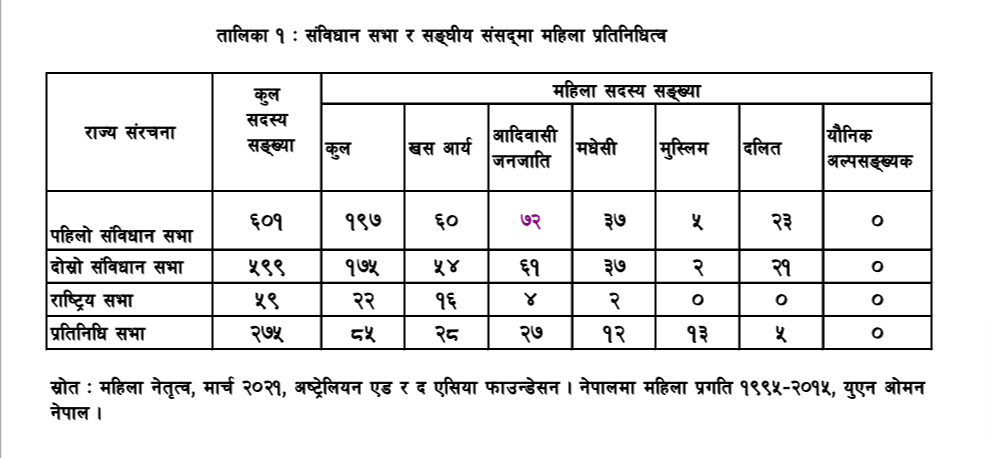संविधान सभाको ६०१ सदस्यका लागि २०६४ सालमा भएको निर्वाचनमा १९७ महिला निर्वाचित भए । निर्वाचित महिलामध्ये आदिवासी जनजाति ७२, खसआर्य ६०, मधेसी ३७, दलित २३ जना र मुस्लिम पाँच जना थिए । त्यस्तै, दोस्रो संविधान सभाको ५९९ सदस्यका लागि २०७० सालमा भएको निर्वाचनमा १७५ महिला निर्वाचित भए । निर्वाचित १७५ महिलामध्ये आदिवासी जनजाति ६१, खसआर्य ५४, मधेसी ३७, दलित २१ र मुस्लिम दुई जना थिए ।