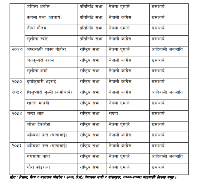 त्यस्तै, २०४८ देखि २०५६ सालबिचको अवधिमा पटक पटक गरी राष्ट्रिय सभामा कुल १४ जना महिलाको प्रतिनिधित्व भयो । त्यसमध्ये खसआर्य ११ जना र आदिवासी जनजाति तीन जना थिए । मधेसी, मुस्लिम र दलित महिलाको प्रतिनिधित्व नै थिएन । प्रतिनिधि सभामा निर्वाचत भएका महिलाहरू र राष्ट्रिय सभामा मनोनीत सङ्ख्यामा बढी देखिए पनि उही अनुहारहरू पटक पटक दोहोरिए । (हेर्नुहोस : परिशिष्ट १)