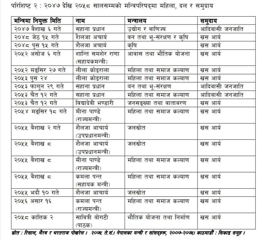 नेपालको मन्त्रिपरिषद्मा पनि महिलाको प्रतिनिधित्व अन्त्यन्तै कम रहेको छ । २०४८ देखि २०५६ सालसम्म पटक पटक गठन भएको मन्त्रिपरिषद्मा मन्त्री, राज्यमन्त्री र सहायकमन्त्री गरी १४ जना महिला मन्त्री बने । ती महिला मन्त्रीको समुदायगत तथ्याङ्क हेर्दा ११ जना खसआर्य र तीन जना आदिवासी जनजाति थिए । मधेसी, दलित र मुस्लिम महिलाको प्रतिनिधित्व शून्य थियो । मन्त्री परिषद्मा पनि एकै व्यक्ति पटक पटक दोहोरिएको देखियो । (हेर्नुहोस् : परिशिष्ट २)