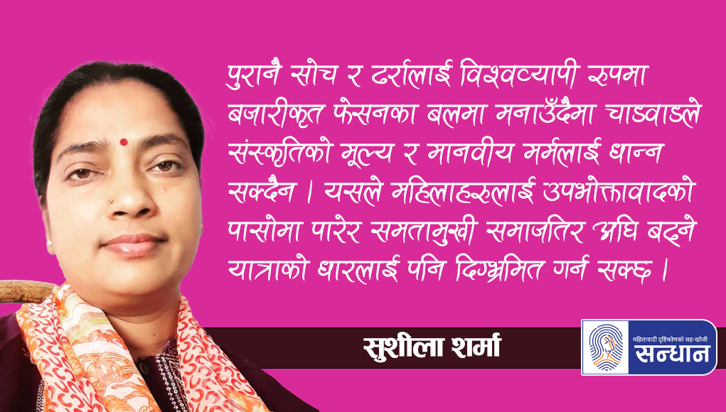 समतामूलक नयाँ सभ्यतालाई आघात पार्ने पुरानै सोच र ढर्रालाई विश्वव्यापी रूपमा बजारीकृत फेसनका बलमा मनाउँदैमा चाडवाडले संस्कृतिको मूल्य र मानवीय मर्मलाई धान्न सक्दैन । यसले महिलाहरूलाई उपभोक्तावादको पासोमा पारेर समतामुखी समाजतिर अघि बढ्ने यात्राको धारलाई पनि दिग्भ्रमित गर्न सक्छ । यसैले संस्कृति र सभ्यताको हस्तान्तरण र पुस्तान्तरण त गरौँ तर रूपान्तरणलाई ध्यानमा राखेर । युगानुकूल विभेद हटाउने, दिग्भ्रम चिर्ने र आफ्ना चाडवाडलाई सकारात्मक परिमार्जनसहित मनाउने कामको अगुवाइ महिलाबाटै भए झनै राम्रो । यसै पनि फेसन र महिलाको पवित्रतालाई जाँच्ने कसी त हुनै हुन्न, नेपाली चाडवाड ।
