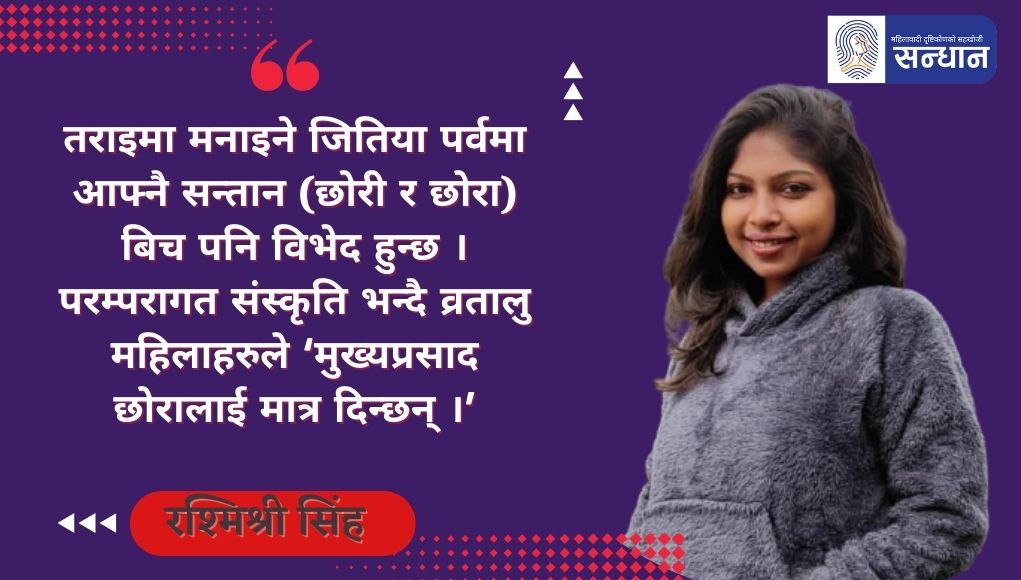 मनमनै सोच्न थालेँ, अघिदेखि यो पर्वका लागि तयारी गर्ने म अर्थात् छोरी । ममीसँगै बिहान उठ्ने छोरी । व्रत खोल्ने दिन पनि मिठोमसिनो खाना पकाएर खुवाउने छोरी । व्रतको बेला दिनरात चिन्ता गर्ने पनि छोरी । अनि प्रसाद चाहिँ छोराका लागि मात्र ? यो प्रश्न धेरै बेरसम्म मनभित्र लुकाएर राख्न सकिनँ । यता म सोचमा थिएँ उता चाहिँ बाबाआमा र अरू महिलाहरूबिच यही कुरामा बहस भइरहेको थियो ।