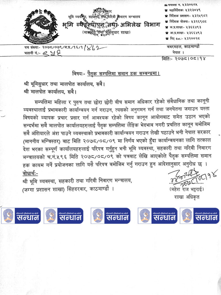 भूमि व्यवस्था, सहकारी तथा गरिबी निवारण मन्त्रालयले २०७८ मङ्सिर ९ गते पैतृक सम्पत्तिमा लैङ्गिक भेदभाव नगरी प्रचलित कानुनअनुसार सबै अंशियारले अंश पाउने व्यवस्थाको प्रभावकारी कार्यान्वयन गर्न देशभरिका मालपोत कार्यालयहरूमा परिपत्र गर्यो ।