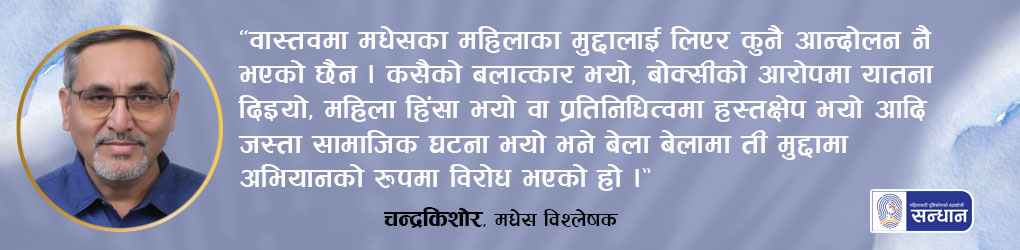 मधेस आन्दोलनले ‘दोहरो–तेहरो मार’ मा परेका तर राज्यको असमावेशी सोच र संरचनाका कारण विभेद सहन बाध्य भएका मधेसका महिलाका मुद्दाहरू बेवास्तामा परेका छन् ।