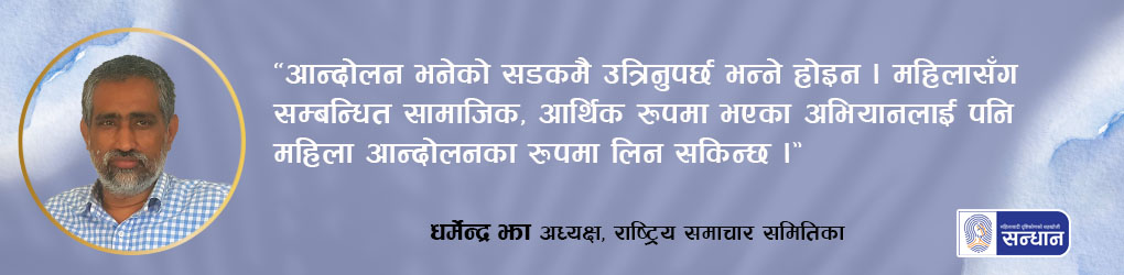 मधेसका महिलाको पृथक आन्दोलन र अभियानका सम्बन्धमा पत्रकार तथा राष्ट्रिय समाचार समितिका अध्यक्ष धर्मेन्द्र झा भन्नुहुन्छ, “आन्दोलन भनेको सडकमै उत्रिनुपर्छ भन्ने होइन । महिलासँग सम्बन्धित सामाजिक, आर्थिक रूपमा भएका अभियानलाई पनि महिला आन्दोलनका रूपमा लिन सकिन्छ ।”