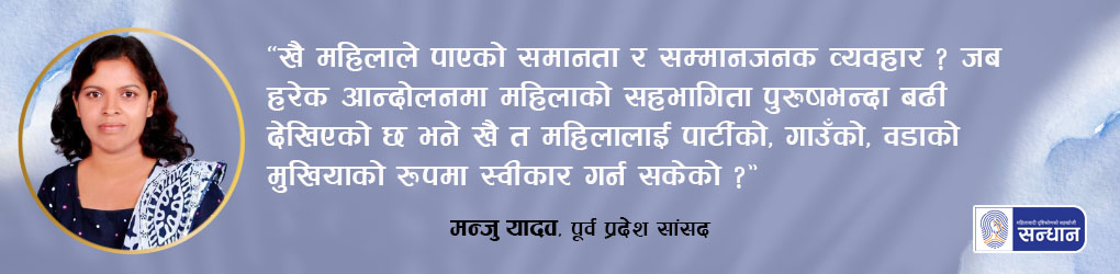 “सङ्घीयता आयो । सबै नागरिक हुन् । एक समान छन्, भेदभाव गर्न पाइँदैन भनेर संविधानमै लेखिएको छ नि !” भन्दै मधेश प्रदेशकी पूर्व प्रदेश सांसदसमेत रहेकी नेपाल कम्युनिष्ट पार्टी (एस) की मन्जु यादव प्रश्न गर्नुहुन्छ, “तर खै महिलाले पाएको समानता र सम्मानजनक व्यवहार ? जब हरेक आन्दोलनमा महिलाको सहभागिता पुरुषभन्दा बढी देखिएको छ भने खै त महिलालाई पार्टीको, गाउँको, वडाको मुखियाको रूपमा स्वीकार गर्न सकेको ?”