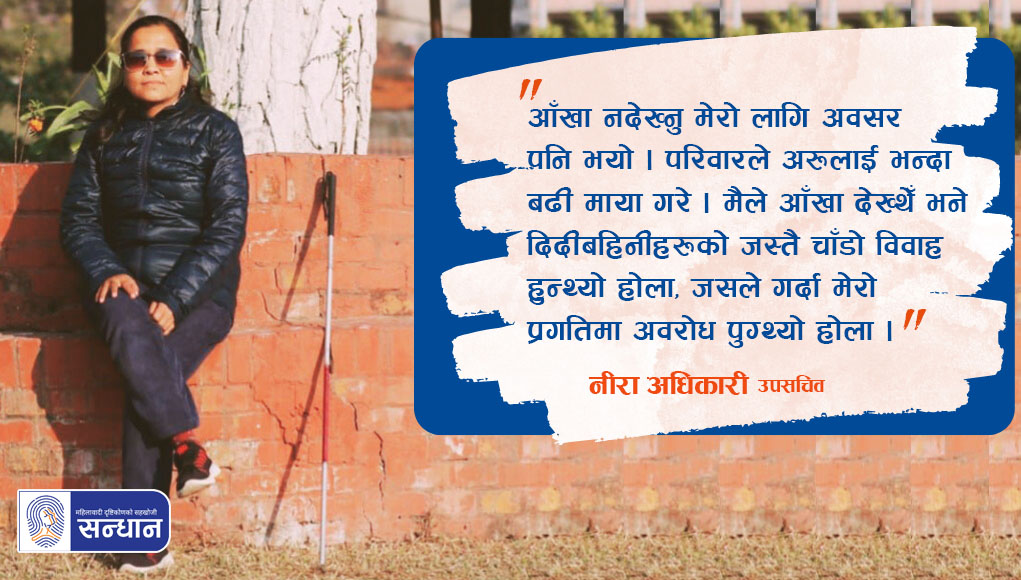(विभिन्न सङ्घसंस्था, व्यक्ति र समूहहरूबाट प्रकाशित प्रसारित महिलाहरूको जीवनकथालाई ‘सन्धान सहकार्य’ अन्तर्गत हामीले साभार गरी प्रकाशन प्रसारण गर्दै आएका छौँ । यसै क्रममा मोतीदेवी स्मृति केन्द्रद्वारा प्रकाशित ‘प्रेरणादायी महिलाहरू’ पुस्तक (२०७९ मा प्रकाशित सातौँ संस्करण) मा निर्मला धितालले ‘आँखाले हैन, चेतनाले संसार देख्ने नीरा’ शीर्षकमा लेख्नुभएको नीरा अधिकारीको कथालाई सामान्य सम्पादनसहित साभार गरिएको हो ।)