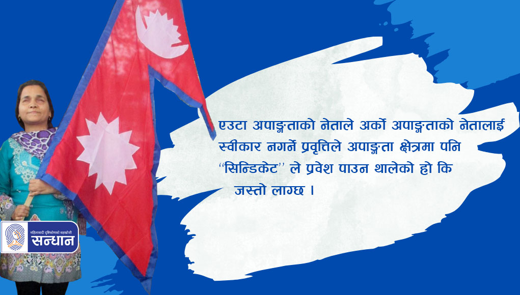 अपाङ्गताभित्र पनि तेरा मान्छे र मेरा मान्छे भन्ने, एउटाले गरेको प्रगतिमा अर्कोले खुट्टा तान्ने, गुट, उपगुट, जातिगत र वर्गगत विभेद छ । यस्तो कुराले मुद्दा तथा सवालहरू कमजोर हुँदै जान्छन् । एउटा अपाङ्गताको नेताले अर्को अपाङ्गताको नेतालाई स्वीकार नगर्ने प्रवृत्तिले अपाङ्गता क्षेत्रमा पनि ‘सिन्डिकेट’ ले प्रवेश पाउन थालेको हो कि जस्तो लाग्छ उहाँलाई । भन्नुहुन्छ, “यो राम्रो होइन ।”