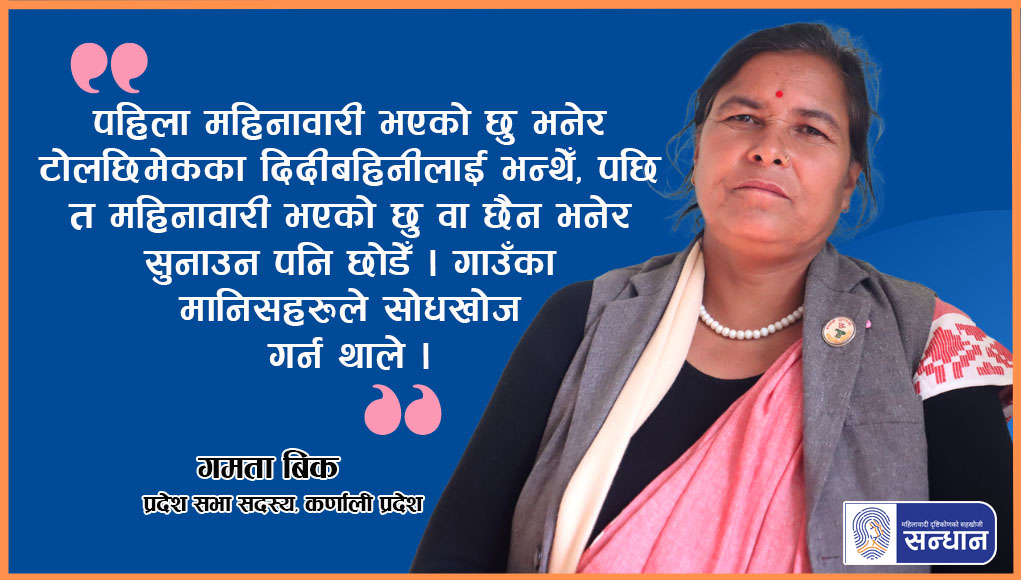 गमता नेकपा एमाले कर्णाली प्रदेश कमिटी सदस्य तथा अखिल नेपाल महिला संघको केन्द्रीय सदस्य हुनुहुन्छ । प्रस्तुत छ, छाउपडी विरुद्धको अभियानलगायत विभिन्न अभियान र राजनीतिबारे गमता विकसँग ‘सन्धान’ का तर्फबाट लक्ष्मी बस्नेतगार्डिका बज्राचार्यले गर्नुभएको कुराकानीको सम्पादित अंश :