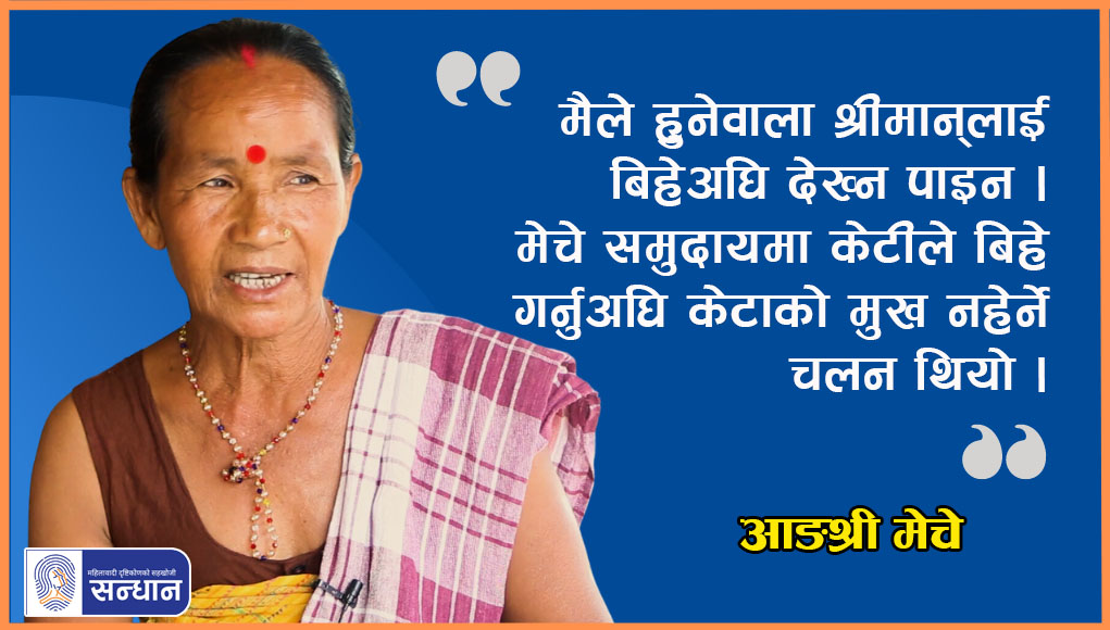 केही महिनाअघि सन्धान टोली झापाको मेचे बस्ती झापाको हल्दिबारी गाउँपालिका वडा नम्बर ४ ऐनाबारी पुगेको थियो । त्यतिबेला बस्तीमा भेटिएकी आङश्रीसँग मेचे समुदायको अवस्था, पुर्ख्यौली पेसा, समुदायमा आएको परिवर्तन जस्ता विषयमा कुराकानी गरिएको थियो । प्रस्तुत छ, ‘सन्धान’ का तर्फबाट गार्डिका बज्राचार्य र समीक्षा गाहाले आङश्री मेचेसँग गर्नुभएको कुराकानीको सम्पादित अंश: