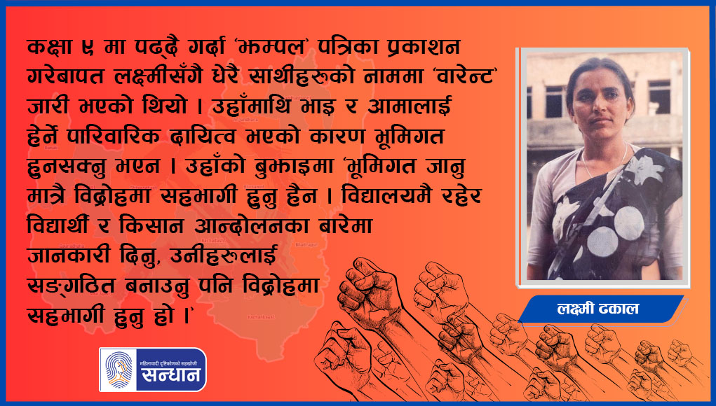 कक्षा ९ मा पढ्दै गर्दा ‘झम्पल’ पत्रिका प्रकाशन गरेबापत लक्ष्मीसँगै धेरै साथीहरूको नाममा ‘वारेन्ट’ जारी भएको थियो । पछि उहाँ भूमिगत भने हुनसक्नु भएन । उहाँमाथि भाइ र आमालाई हेर्ने पारिवारिक दायित्व थियो । उहाँको बुझाइमा ‘भूमिगत जानु मात्रै विद्रोहमा सहभागी हुनु हैन । विद्यालयमै रहेर विद्यार्थी आन्दोलन र किसान आन्दोलनका बारेमा विद्यार्थीलाई जानकारी दिनु, उनीहरूलाई सङ्गठित बनाउनु पनि विद्रोहमा सहभागी हुनु हो ।’ उहाँ यसरी नै झापा आन्दोलनमा सहभागी हुनुभयो ।