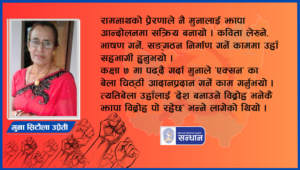 झापालाई केन्द्रविन्दुमा राखेर हुनेगरेका विभिन्न आन्दोलनका सहभागी नेताहरूलाई लुकाउने, खाना खुवाउने र उनीहरूको गोप्य सूचना आदानप्रदान गर्ने काममा मुना सक्रिय नै रहनुभयो ।