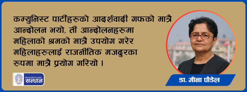 झापा आन्दोलन होस् या माओवादी सशस्त्र द्वन्द्व, महिलाहरूलाई राजनीतिक मजदुरका रूपमा मात्रै प्रयोग गरिएको दाबी गर्नुहुन्छ समाजशास्त्री डा. मीना पौडेल । महिलाहरूलाई आन्दोलनको बेला ‘इमोशनल ब्ल्याकमेल’ गरिएको र आफ्ना लागि सेल्टर होमहरूको व्यवस्थापनमा महिलाहरूको इच्छा भएर वा नभएर पनि प्रयोग गरिएको पनि उहाँको विश्लेषण छ । मानव अधिकार तथा महिला अधिकारकर्मीका रूपमा परिचित समाजशास्त्री डा. मीना ४० प्रतिशत महिला जनमुक्ति सेना भएको माओवादीमा समायोजनको प्रक्रिया र संसदीय अभ्यास गर्ने बेलामा पाँच प्रतिशनि महिलत पा सक्रिय नभएको विश्लेषण गर्नुहुन्छ । “यस्तो हुनाको पछाडि कम्युनिस्ट पार्टीहरूको आदर्शवादी गफको मात्रै आन्दोलन भएको, महिलाको श्रमको मात्रै उपयोग गरिएको र महिलाहरूलाई राजनीतिक मजदुरका रूपमा प्रयोग गरिएको” उहाँको आरोप छ ।