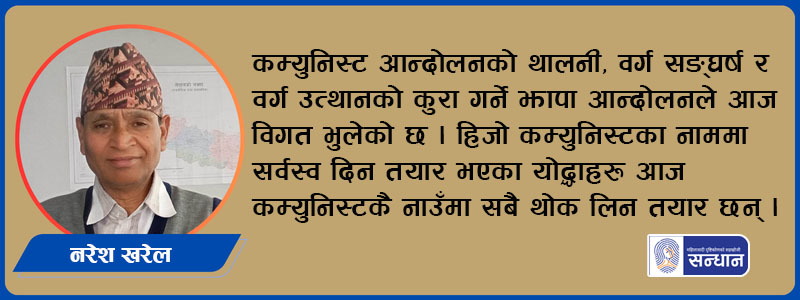 पार्टीले विधि र विधान भुलेको आरोप आन्दोलनमा सहभागी महिला नेताहरूको मात्रै होइन, आन्दोलनका अगुवा नरेशको पनि छ । उहाँको भनाइमा कम्युनिस्ट आन्दोलनको थालनी, वर्ग सङ्घर्ष र वर्ग उत्थानको कुरा गर्ने झापा आन्दोलनले आज आफ्नो विगत भुलेको छ । हिजो कम्युनिस्टका नाममा सर्वस्व दिन तयार भएका योद्धाहरू आज कम्युनिस्टका नाउँमा सबै थोक लिन तयार छन् ।