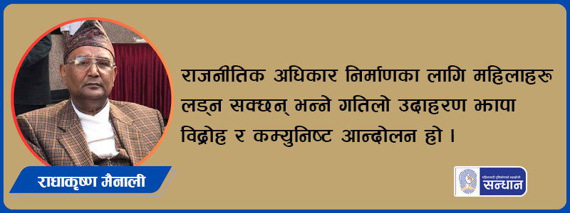 राजनीतिक अधिकार निर्माणका लागि महिलाहरू पनि लड्न सक्छन् भन्ने गतिलो उदाहरण झापा विद्रोह र कम्युनिष्ट आन्दोलन भएको झापा आन्दोलनका एक अगुवा राधाकृष्ण मैनाली बताउनुहुन्छ ।