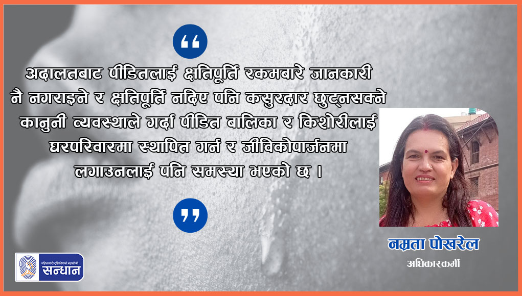 पीडितले न्यायको महसुस गर्न पाउने आधार क्षतिपूर्ति र पीडकलाई दिइने सजाय हो तर अदालतबाट पीडितलाई क्षतिपूर्ति रकमबारे जानकारी नै नगराइने र क्षतिपूर्ति नदिए पनि कसुरदार छुट्नसक्ने कानुनी व्यवस्थाले गर्दा पीडितहरूले न्यायको अनुभूति गर्न पाएका छैनन् । यस सम्बन्धमा अधिकारकर्मी नम्रता पोखरेल भन्नुहुन्छ, “यसले पीडित बालिका र किशोरीलाई घरपरिवारमा स्थापित गर्न र जीविकोपार्जनमा लगाउनलाई पनि समस्या भएको छ ।”