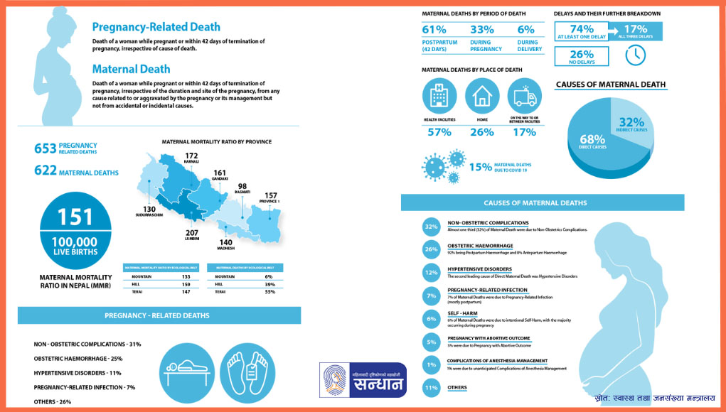 राष्ट्रिय जनगणना २०७८ को प्रतिवेदन सार्वजनिक भएसँगै गरिएको मातृ–मृत्युको अध्ययनले नेपालको मातृ–मृत्यु दर प्रति एक लाखमा १५१ जना रहेको देखाउँछ । नेपालमा यसअघि मातृ–मृत्युको दर सन् २०१६ मा २३९ जना, २००६ मा २८१ जना, १९९६ मा ५३९ जना र १९९० मा ७७० जना रहेको थियो । यो तथ्याङ्कलाई भिडाएर हेर्दा नेपालले मातृ–मृत्यु दर घटाउनमा धेरै प्रगति गरेको देखिन्छ । झट्ट हेर्दा मातृ–मृत्यु दरमा निकै कमी आइसकेको देखिए पनि अहिलेको नेपालको मातृ–मृत्यु दरलाई सामान्य मान्न सकिन्न ।