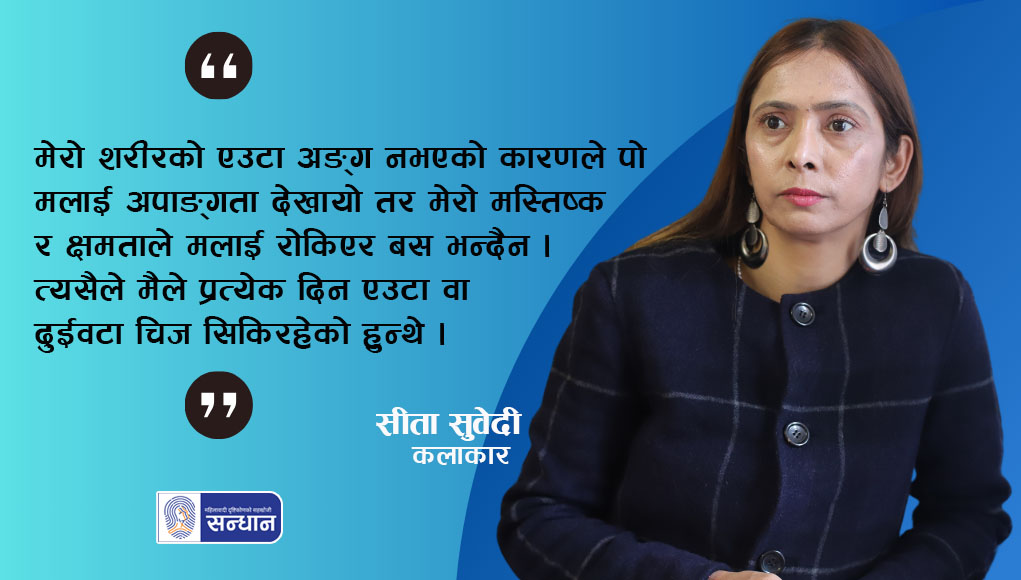प्रत्येक वर्ष ३ डिसेम्बरमा ‘विश्व अपाङ्गता दिवस’ मनाइन्छ । सोही सन्दर्भ पारेर ‘सन्धान’ ले सीता सुवेदीलाई भेटी उहाँको नृत्य, गायन कलासँगै शारीरिक अपाङ्गताको अवस्थामा उहाँले भोग्नुपरेका चुनौती र साहसका बारेमा कुराकानी गरेको हो । प्रस्तुत छ, कलाकार सीता सुवेदीसँग ‘सन्धान’ का तर्फबाट क्यामेरामा आधारबाबु खतिवडाका साथमा समीक्षा गाहाले हालै गर्नुभएको कुराकानीको सम्पादित भिडियो अंश :