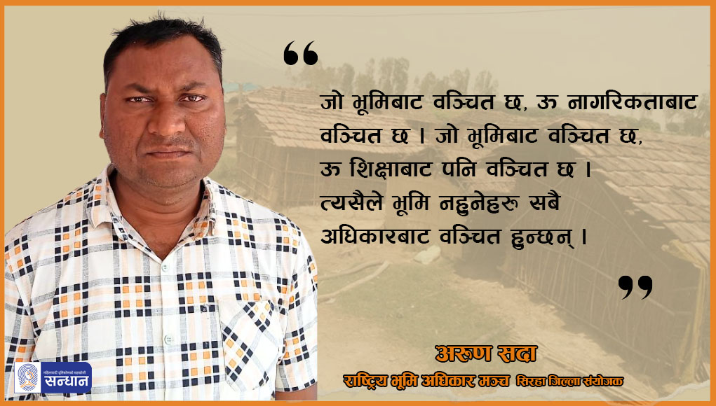 राष्ट्रिय भूमि अधिकार मञ्च, सिरहाको जिल्ला संयोजक अरुण सदा दुई दशकदेखि भूमि अधिकारको आन्दोलनमा सक्रिय हुनुहुन्छ । सिरहाकै विपन्न मुसहर समुदायमा हुर्किंदै गर्दादेखि नै भूमि अभावको पीडाले गर्दा आफू अधिकारको आन्दोलनमा लागेको उहाँ बताउनुहुन्छ । अरुण सिरहास्थित ‘शवरी सङ्कल्प समाज’ को अध्यक्ष पनि हुनुहुन्छ । उहाँका अनुसार, संस्थाले मुसहर समुदायको शिक्षा, स्वास्थ्य, सामाजिक न्यायका साथै भूमि र माटोको अधिकारका लागि काम गर्दै आएको छ । भूमिहीनता र भूमिअधिकारकर्मीको अनुभवको बारेमा बोल्न एक कार्यक्रमको मञ्चमा पुग्दा उहाँ मञ्चमै भावुक हुनुभयो । बोल्दै गर्दा असहजताले केहीबेर मौन रहेपछि मात्रै फेरि आफ्ना भनाइलाई अघि बढाउन सक्नुभयो ।