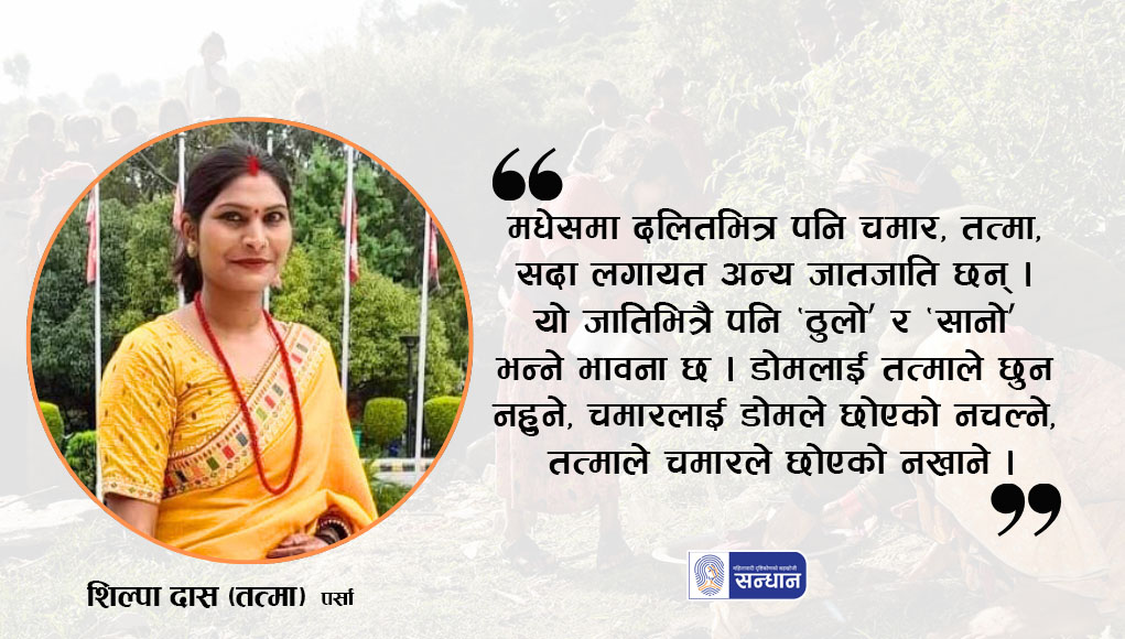 मधेशमा हामीले विभेद नै विभेद भोग्दै आइरहेका छौँ । गैरदलितबाट हामीलाई विभेद नहुने कुरै भएन । दलितभित्रबाटै पनि दलितलाई छुवाछुत र विभेद हुन्छ । मधेसमा दलितभित्र पनि चमार, तत्मा, सदा लगायत अन्य जातजाति छन् । यो जातिभित्रै पनि ‘ठुलो’ र ‘सानो’ भन्ने भावना छ । डोमलाई तत्माले छुन नहुने, चमारलाई डोमले छोएको नचल्ने, तत्माले चमारले छोएको नखाने । एकले अर्काेलाई घृणा र छुवाछुत नै गर्ने । यस्तो भइरहेको देखिन्छ । मेरो अनुभवमा सबैभन्दा पहिला दलित समुदायबाट छुवाछुत सुरु भएको देखिन्छ । यो त दलितले दलितलाई गर्ने छुवाछुत विभेदका कुरा भयो ।