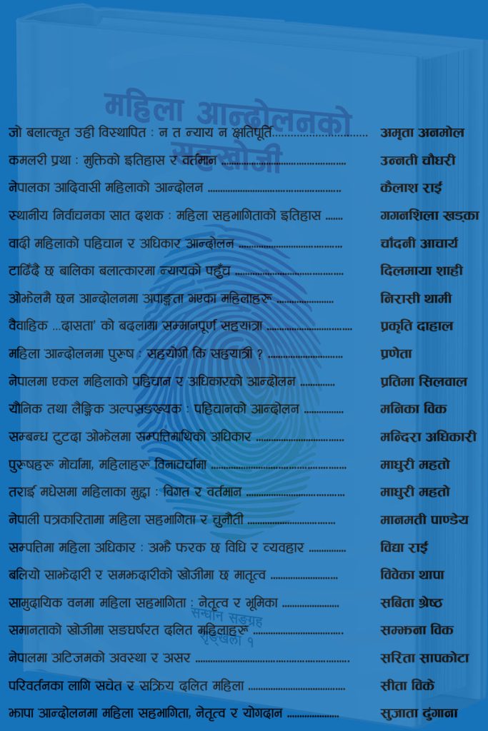पुस्तकमा महिला आन्दोलनका विविध पक्षका साथै कर्णाली र लुम्बिनी प्रदेशमा बलात्कार घटनाका पीडित नाबालिकाको अवस्था र न्याय पाउनमा भइरहेको सङ्घर्षलगायत विभिन्न विषयका २२ वटा आलेख छन् ।