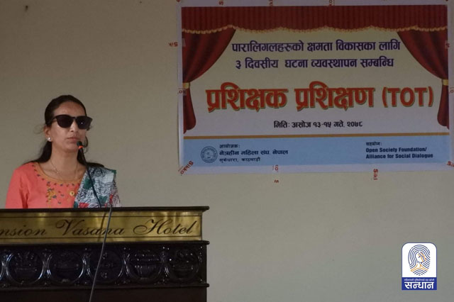 नेत्रहीन संघको केन्द्रीय साधारण सभामा भाग लिन २०५८ साल वैशाखमा काठमाडौँ आउने अवसर पाएँ । केन्द्रको नेत्रहीन संघमा केन्द्रीय महिला समिति पनि थियो । त्यो समितिमा मलाई पनि राखियो । केन्द्रमा आबद्ध भएपछि महिला, बालबालिका तथा समाजकल्याण मन्त्रालयबाट अपाङ्गता भएका महिलाहरूका लागि व्यवस्था गरेको ‘सेक्रेटारियल साइन्स’ सम्बन्धी छ महिनाको तालिम लिने अवसर पाएँ । म त्यो तालिमका लागि छ महिना काठमाडौँ बस्दा मलाई धेरै कुराको जानकारी भयो । सबैभन्दा ठुलो कुरा आत्मविश्वास बढ्यो ।
