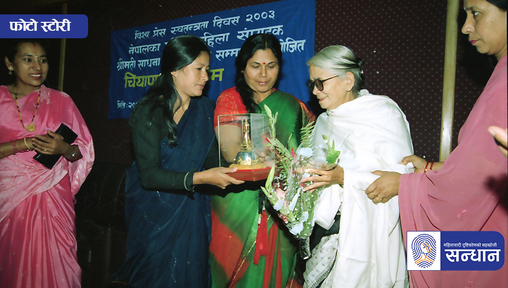 प्रेस स्वतन्त्रता दिवसको अवसर पारेर २०६० बैशाखमा राष्ट्रिय महिला आयोगमा साधना प्रधानलाई पहिलो सम्पादक महिलाका रूपमा सम्मान गरिएको थियो । त्यस कार्यक्रमको फोटोमा देखिनुभएकी राष्ट्रिय समाचार समितिका तत्कालीन पत्रकार निर्मला आचार्यसँग गरिएको कुराकानीमा आधारित यो स्मृति प्रस्तुत गर्दैछौँ । पत्रकार आचार्यले २०७३ सालमा समितिको महाप्रबन्धकबाट अवकाश प्राप्त गर्नुभएको हो ।