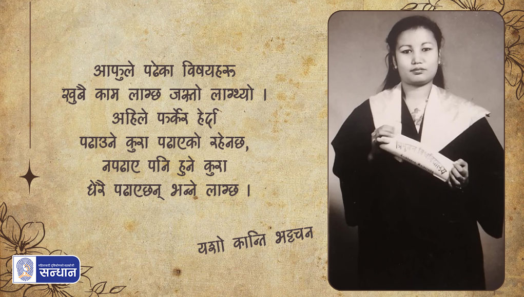 स्नातक तह पास गरेपछि त्रिभुवन विश्वविद्यालयबाट आयोजित दीक्षान्त समारोहमा उहाँले भाग लिनुभयो । त्यति बेला महिला साथीहरूसँग खिचिएको एउटा सामूहिक तस्बिरमा उहाँ देखिनुहुन्छ । राष्ट्रिय आदिवासी जनजाति महिला महासंघकी संस्थापक सदस्य र सल्लाहकार, तथा हाल राष्ट्रिय आदिवासी जनजाति महिला मञ्चकी उपाध्यक्ष यशो कान्तिसँग सोही तस्बिरका माध्यमबाट उहाँको व्यक्तिगत जीवन र तत्कालीन शैक्षिक तथा सामाजिक सन्दर्भलाई जोड्ने प्रयास गरिएको छ । प्रस्तुत छ, यशो कान्ति भट्टचनसँग ‘सन्धान’ का तर्फबाट समीक्षा गाहाले कुराकानी गरी तयार गर्नुभएको ‘फोटो कथा’ :