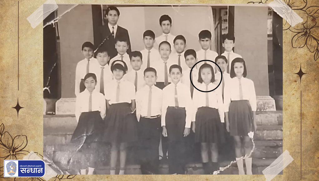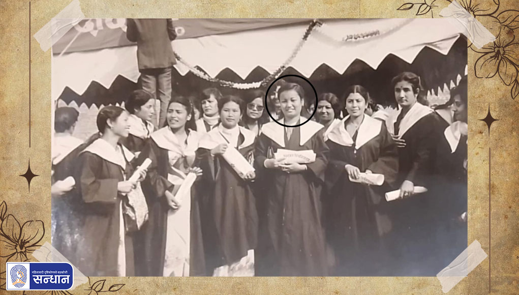 म २०३४/३५ सालतिर पद्मकन्यामा होम साइन्स (गृहविज्ञान) विषय लिएर स्नातक तहमा पढ्थेँ । यो छात्राहरू मात्र अध्ययन गर्ने क्याम्पस हो । आजभन्दा ४५/४६ वर्षअगाडि अहिले जस्तो विद्यार्थी धेरै हुँदैनथे । विभिन्न कारणले गर्दा स्नातक तह सकिनेबित्तिकै दीक्षित हुन पाएको थिइनँ । २०३८ सालमा म स्नातकोत्तर तह पहिलो वर्ष पढ्न थालेपछि बल्ल स्नातक तहको दीक्षित भएँ । यो दीक्षान्त समारोहमा सहभागी हुने क्रममा लिइएको फोटो हो । अहिले जस्तो फोटो खिच्न सजिलो थिएन । दीक्षान्त समारोह भएकाले साथीसाथी मिलेर खिचेका थियौँ । दीक्षान्त समारोह दशरथ रङ्गशालामा भएको थियो । त्यहाँ दीक्षित हुनेहरू भरिभराउ हुन्थे । म २६ वर्षको थिएँ होला, दीक्षित हुँदा । दीक्षान्तमा गाउन र टोपी लाउने अनि फोटो खिच्ने रहर खुबै हुन्थ्यो । त्यो समयमा कलर फोटो हुँदैन थियो । सादा नै फोटो भए पनि खिचाउने रहर भने उस्तै हुन्थ्यो ।