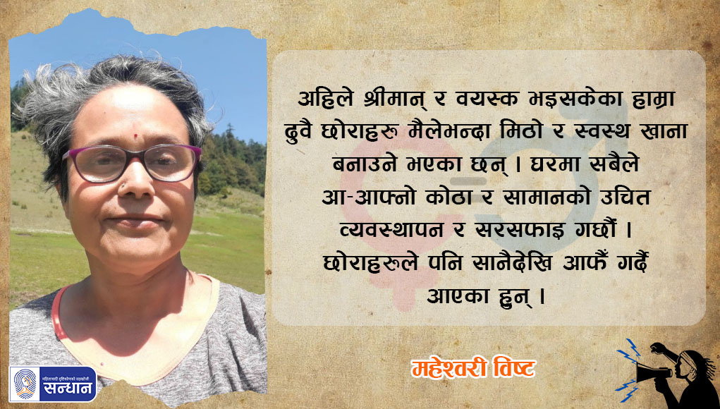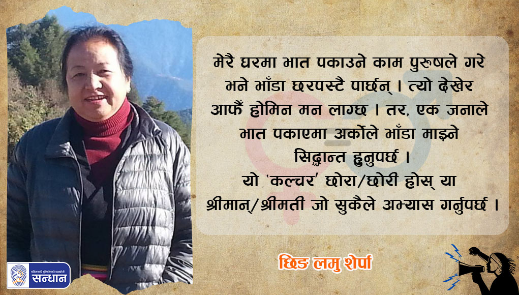 मेरै घरमा भात पकाउने काम पुरुषले गरे भने भाँडा छरपस्टै पार्छन् । त्यो देखेर आफैँ होमिन मन लाग्छ । तर, एक जनाले भात पकाएमा अर्कोले भाँडा माझ्ने सिद्धान्त हुनुपर्छ । यो ‘कल्चर’ छोरा/छोरी होस् या श्रीमान्/श्रीमती जो सुकैले अभ्यास गरे भने बल्ल घरभित्र पनि केही हदसम्म समानता हुन्छ ।