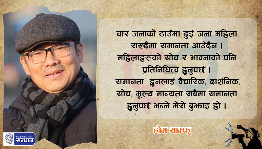 चार जनाको ठाउँमा दुई जना महिला राख्दैमा समानता आउँदैन । महिलाहरूको सोच र भावनाको पनि प्रतिनिधित्व हुनुपर्छ । ‘समानता’ हुनलाई वैचारिक, दार्शनिक, सोच, मूल्य मान्यता सबैमा समानता हुनुपर्छ भन्ने मेरो बुझाइ हो ।