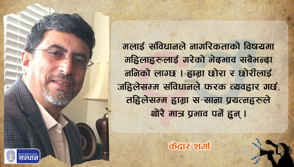 मलाई संविधानले नागरिकताको विषयमा महिलाहरूलाई गरेको भेदभाव सबैभन्दा ननिको लाग्छ । हाम्रा छोरा र छोरीलाई जहिलेसम्म संविधानले फरक व्यवहार गर्छ, तहिलेसम्म हाम्रा स–साना प्रयत्नहरूले थोरै मात्र प्रभाव पर्ने हुन् । तर, राज्यले भेदभाव गरेको छ भनेर चुप लाग्नुको साटो हामीले आफ्ना ससाना प्रयत्नहरूलाई अझ घनीभूत बनाउनुपर्छ ।