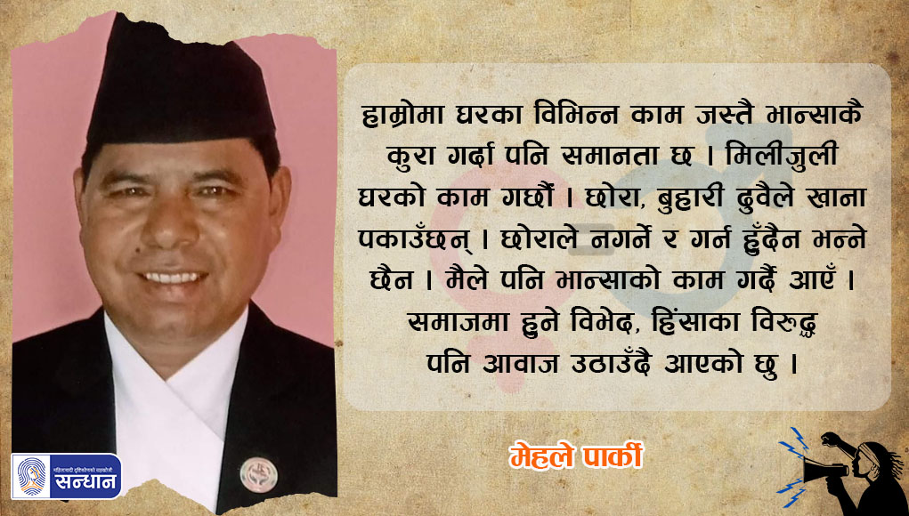 घरपरिवारमा मेरो समानताको अभ्यास भनेको श्रीमती, छोराछोरी, दिदीबहिनीको सबैको विचार सुन्ने र छलफल गर्ने हो । भान्साको काम पनि कसले भ्याउँछौँ, उसैले गर्ने हो । भान्साको काम ‘मैले गर्न हुँदैन’ अथवा ‘छोराले गर्न हुँदैन’, ‘महिलाले नै गर्नुपर्छ’ भन्ने हाम्रो घरमा कहिल्यै भएको छैन र हुँदैन ।