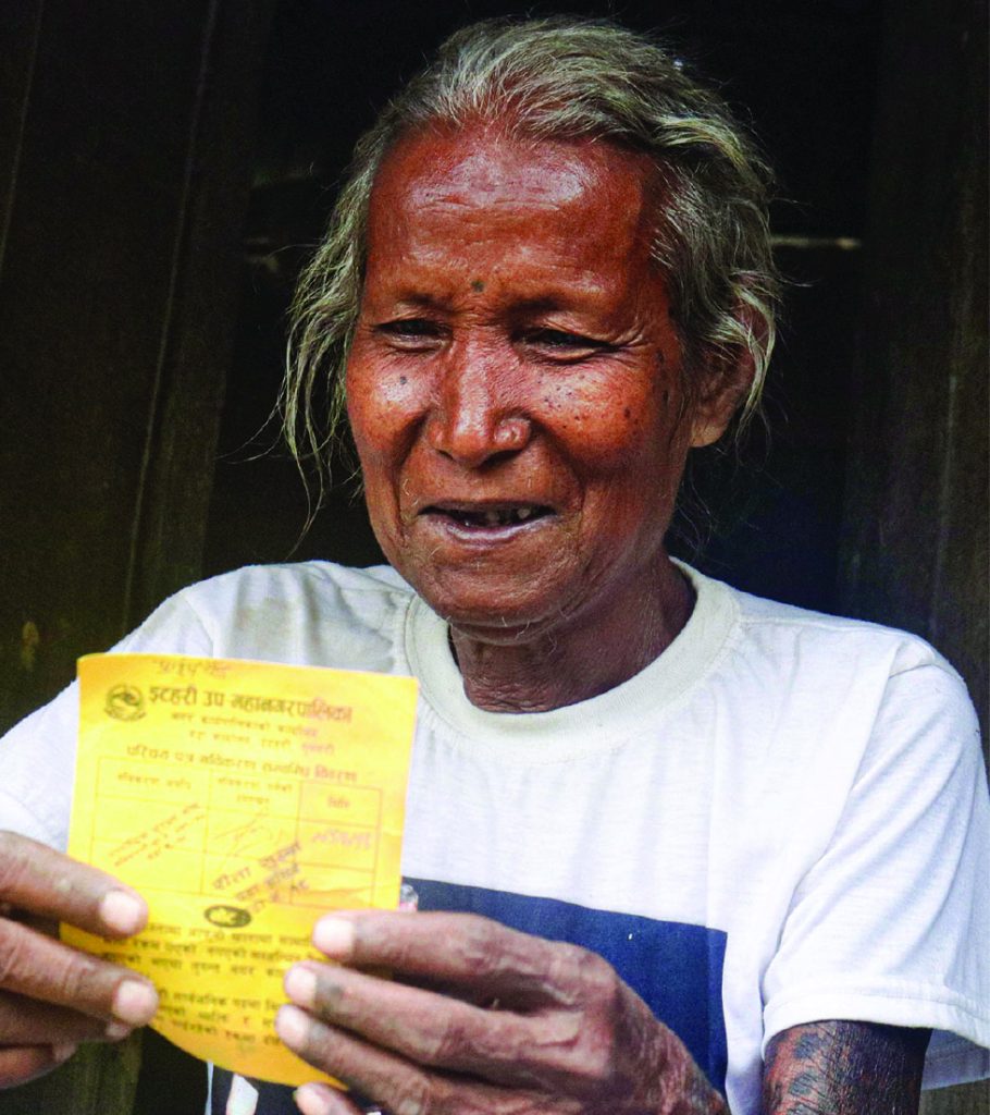 मितिनी नेपालले मलाई पुरुषको रूपमा चिनाउने कानुनी कागजातहरू प्रयोग गरी ज्येष्ठ नागरिक भत्ताका लागि निवेदन दिन सहयोग गर्यो । साथै, परिवारको तर्फबाट मेरो जेठो दाजुका छोरालाई साक्षी बनाउन वडा कार्यालय लिएर गयो । त्यसपछि मात्रै मैले ज्येष्ठ नागरिक भत्ता प्राप्त गरेको हो ।