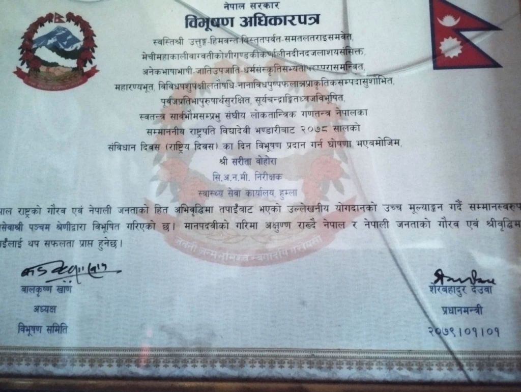 लोकसेवा परीक्षा पास गरी उहाँले मातृशिशु स्वास्थ्यको क्षेत्रमा जाजरकोट र हुम्लाका गाउँगाउँमा पुगेर सेवा दिनुभयो । काम गरेर राष्ट्रियलगायत विभिन्न तहका सम्मान तथा पुरस्कार प्राप्त गर्नुभयो । आफूले २०७८ सालमा राष्ट्रपतिका हातबाट ‘जनसेवाश्री पाँचौँ’ पाएको र त्यसको झन्डै एक दशकअघि स्वास्थ्य मन्त्रालयबाट ‘स्वास्थ्य सेवा पुरस्कार’ पाएको कुरा उहाँले सगर्व बताउनुभयो ।