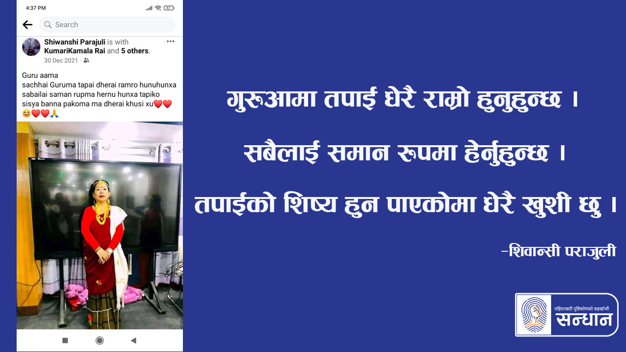 शिवान्सी पराजुलीले आफ्नी शिक्षक कुमारीकमला राईको फोटो सामाजिक सञ्जालमा राखेर माथिका शब्दमा उनीप्रति सम्मान प्रकट गरिन् । शिवान्सीले गुरुङ समुदायका महिलाले लगाउने पोशाक र गहना लगाएको कुमारीकमलाको फोटो राखेकी थिइन् । विद्यालयमा केही समयअघि तमु ल्होसार पर्व मनाउँदाको फोटो थियो, त्यो ।