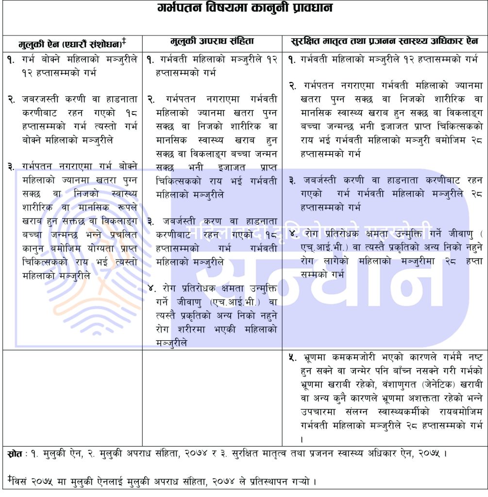 मुुलुकी ऐनमा ‘सरकारले तोके बमोजिमको प्रक्रिया अपनाई निर्धारित योग्यता पूरा गरेगर्भपतन गराउने उद्देश्यले गर्भमा रहेको भ्रूणको लिङ्ग पहिचान हुने काम गर्ने वा गराउने र त्यसरी लिङ्ग पहिचान भएपछि गर्भपतन गर्ने वा गराउने कार्यलाई मुलुकी अपराध संहिताले दण्डनीय मानेको छ ।का इजाजत प्राप्त स्वास्थ्यकर्मीले गर्भपात गराएकोमा’ मात्र गर्भ तुहाएको नमानिने व्यवस्था पनि गरियो ।