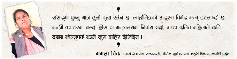 “संसद्मा पुग्नु मात्र ठुलो कुरा रहेन छ, त्यहाँभित्रको अदृश्य विभेद झन् डरलाग्दो छ” कर्णाली प्रदेशको भौतिक पूर्वाधार तथा शहरी विकास राज्यमन्त्री गमताले भन्नुभयो, “मन्त्री क्वाटरमा बस्दा होस् वा मन्त्रालयमा निर्णय गर्दा, एउटा दलित महिलाले कति दबाब झेल्नुपर्छ भन्ने कुरा बाहिर देखिँदैन ।”