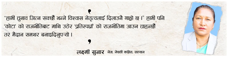 नेपाली कांग्रेसको प्रदेश कार्य समितिमा वा अन्य संरचनामा दलित महिलालाई ‘आमन्त्रित’ वा ‘सदस्य’ का रूपमा थन्क्याइएको पाइयो । सल्यानकी कांग्रेस नेता लक्ष्मी सुनारले त्यसको मूल कारण खुलाउँदै भन्नुभयो “हामी चुनाव जित्न सक्छौँ भन्ने विश्वास नेतृत्वलाई दिलाउनै गाह्रो छ ।” कर्णाली प्रदेश सभा सदस्य रहेकी लक्ष्मीको भनाइ थियो– हामी पनि ‘कोटा’ को राजनीतिबाट माथि उठेर ‘प्रतिस्पर्धा’ को राजनीतिमा आउन चाहन्छौँ तर मैदान समथर बनाइदिनुपर्‍यो ।