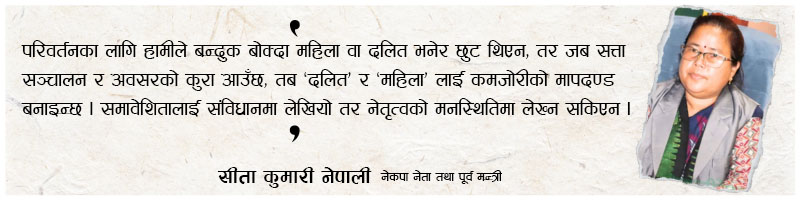 “परिवर्तनका लागि हामीले बन्दुक बोक्दा महिला वा दलित भनेर छुट थिएन, तर जब सत्ता सञ्चालन र अवसरको कुरा आउँछ, तब ‘दलित’ र ‘महिला’ लाई कमजोरीको मापदण्ड बनाइन्छ,” उहाँले भन्नुभयो, “समावेशितालाई संविधानमा लेखियो तर नेतृत्वको मनस्थितिमा लेख्न सकिएन ।”