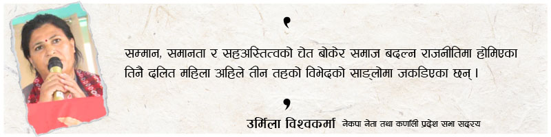 “सम्मान, समानता र सहअस्तित्वको चेत बोकेर समाज बदल्न राजनीतिमा होमिएका तिनै दलित महिला अहिले तीन तहको विभेदको साङ्लोमा जकडिएका छन्,” माओवादी नेता तथा कर्णाली प्रदेश सभा सदस्य उर्मिला विश्वकर्माले भन्नुभयो । उहाँ भौतिक योजना तथा पूर्वाधार राज्यमन्त्री पनि हुनुभएको थियो । कर्णाली प्रदेश सभामा दलित महिलाका पक्षमा जोडदार आवाज उठाउने सदस्यका रूपमा चिनिएकी उहाँले कर्णालीका दलित महिलाहरू गरिबी, जात र लिङ्ग गरी तेहरो उत्पीडनमा रहेको बताउनुभयो ।
