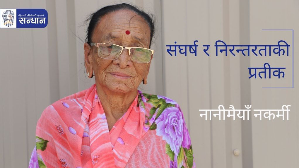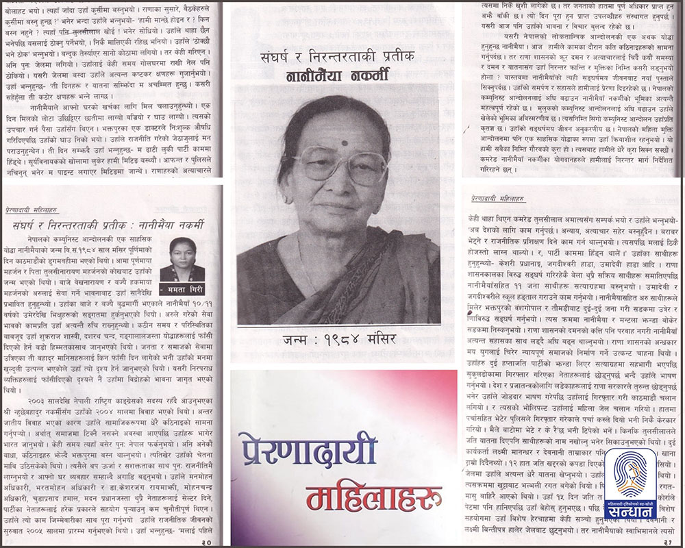 विगतमा विभिन्न सङ्घसंस्था, व्यक्ति र समूहहरूले प्रकाशन/प्रसारण गरेका महिलाका जीवन कथाहरूलाई ‘सन्धान सहकार्य’ अन्तर्गत साभार गरी हामीले ‘सन्धान’ मा प्रकाशनरप्रसारण गर्छौं। यसैक्रममा आज मोतीदेवी स्मृति केन्द्रद्वारा प्रकाशित ‘प्रेरणादायी महिलाहरू’ पुस्तकको दोस्रो संस्करणमा छापिएको नानीमैयाँ नकर्मीको जीवनी ल्याएका छौँ । प्रस्तुत छ, ‘प्रेरणादायी महिलाहरू’ पुस्तकमा ‘संघर्ष र निरन्तरताकी प्रतीक : नानीमैयाँ नकर्मी’ शीर्षकमा ममता गिरीले लेख्नुभएको नानीमैयाँ नकर्मीको जीवनकथाः