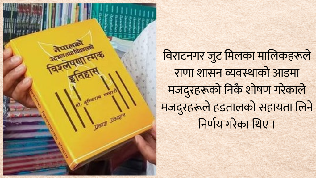 प्रो. ढुण्डिराज भण्डारी (विसं १९८२–२०५३) को पुस्तक ‘नेपालको उद्भव तथा विकासको विश्लेषणात्मक इतिहास’ मा उल्लेख भएअनुसार, विराटनगर जुट मिलका मालिकहरूले राणा शासन व्यवस्थाको आडमा मजदुरहरूको निकै शोषण गरेकाले मजदुरहरूले हडतालको सहायता लिने निर्णय गरेका थिए ।