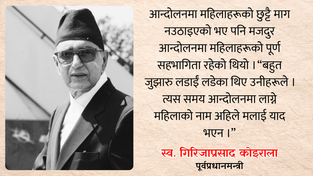 सोही प्रतिवेदनमा कोइरालाको भनाइ उल्लेख छ, “बहुत जुझारु लडाईं लडेका थिए उनीहरूले । त्यस समय आन्दोलनमा लाग्ने महिलाको नाम अहिले मलाई याद भएन ।” स्पष्ट छ, मजदुर आन्दोलनले राजनीतिक मोड लिएपछि मजदुर महिलाहरू जतिसुकै जुझारु भए पनि स्मरणयोग्य हुन सकेनन् । उनीहरूको इमानदार योगदानको फल राजनीतिक अभिष्ट बोकेका व्यक्तिहरूले लिए ।