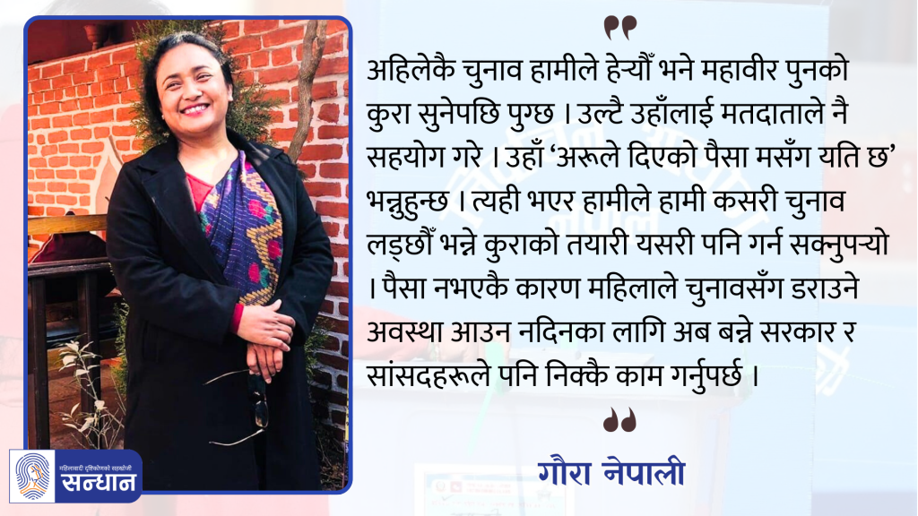 थोरै पैसामा पनि चुनाव लड्छु भन्ने चाहिँ हाम्रो महिलाहरूको पनि मनोबल नहुँदो रहेछ । पैसा छैन उहाँसँग, उहाँ लड्न सक्नुहुन्न भन्ने कुराले नै महिलाहरूलाई निक्कै गाह्रो भएको हो जस्तो लाग्छ । किनभने हामी छलफल गर्दाखेरि चुनावमा पहिला के चाहिन्छ भन्दा सबैले पैसा चाहिन्छ भन्नुभयो । अनि रेनु चन्द (पूर्व माननीय) ले चाहिँ ‘पैसा होइन’ सुरुमा ‘टिकट चाहिन्छ’ भन्नुभयो ।