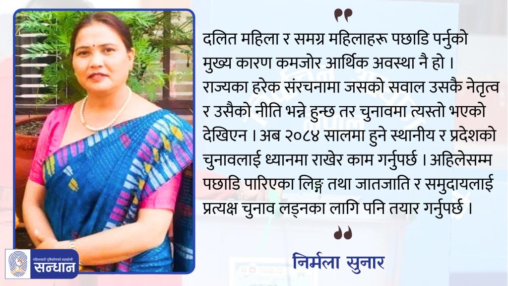 राज्यको नीति कानुन बनाउने ठाउँमा त महिला, दलितलाई झन् प्राथमिकता दिएर लग्नुपर्ने हो, तर दलित महिलाहरू झनै ओझेलमा परेको देखिन्छ । राज्यका हरेक संरचनामा जसको सवाल उसकै नेतृत्व र उसैको नीति भन्ने हुन्छ तर चुनावमा त्यस्तो भएको देखिएन । यस्तो हुन नदिनका लागि सबै खालका महिलाले आफ्नातर्फबाट सचेत भएर खबरदारी अभियान पनि गरिरहनुपर्ने देखिन्छ ।