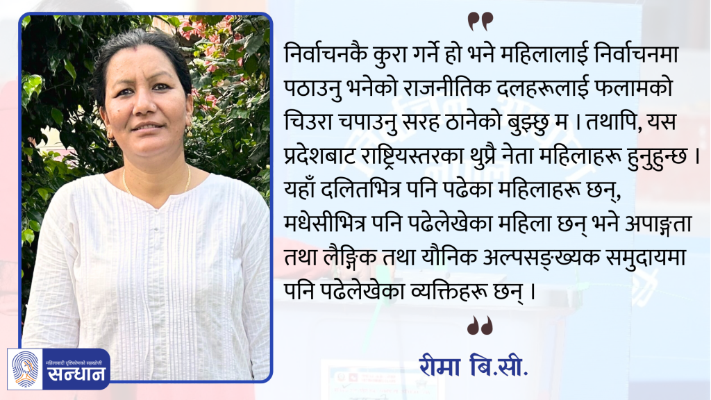 हामीले चुनावअघि प्रदेश लेभलको छलफल गरेका थिर्यौँ । त्यहाँ लगभग ५०–५५ जना महिला नेताहरू हुनुहुन्थ्यो । केन्द्रीय समितिदेखि लिएर प्रदेश कमिटीमा आबद्ध धेरै नेताहरू हुनुहुन्थ्यो । त्यही भएर यहाँ उम्मेदवार हुन सक्ने महिलाहरू नभएको चाहिँ होइन, पार्टीहरूले नपत्याएको मात्र हो महिलाहरूलाई ।