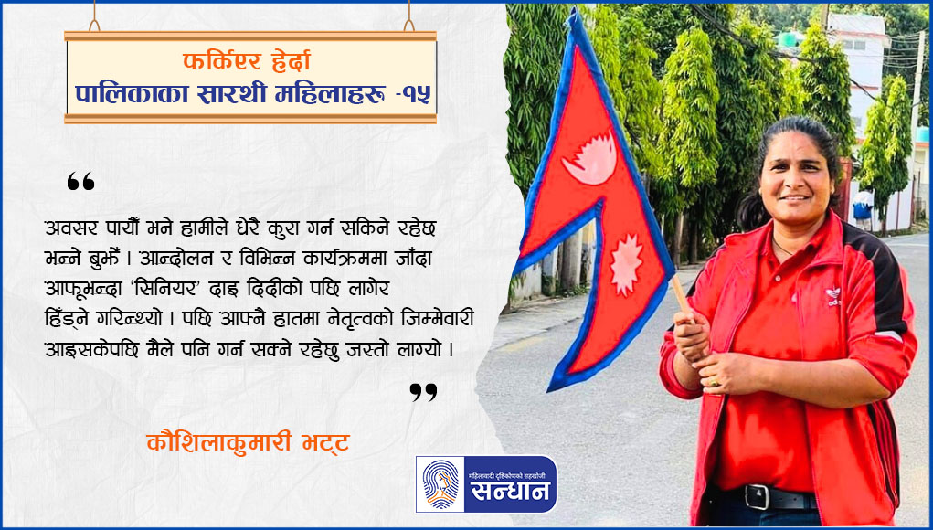 सन्धान संवाद शृङ्खला ८ कार्यकाल २०७४–२०७९ साललाई फर्किएर हेर्दा पालिकाका सारथी महिलाहरूको लहरमा देखापर्ने नाम हो, कौशिलाकुमारी भट्ट । उहाँ देश सङ्घीय संरचनामा रूपान्तरण भएपछि